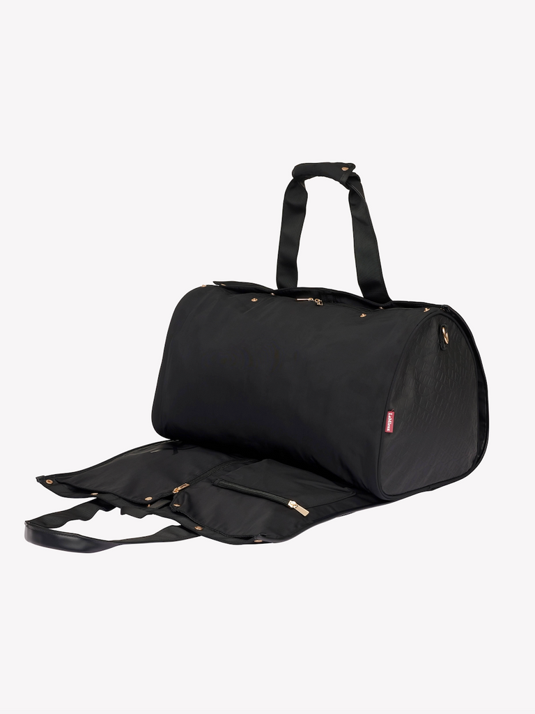 This clever clothing carrier keeps your clothing wrinkle-free and smart until it's time to wear it. A two-in-one duffle bag and show jacket carrier, it's perfect for event and show travel, all in wipe-clean water resistant fabric with luxurious PU leather accents.